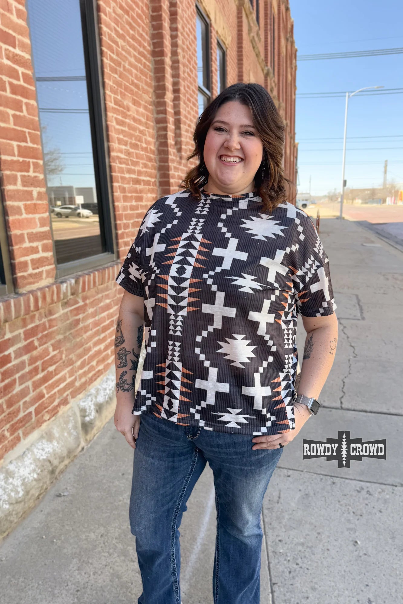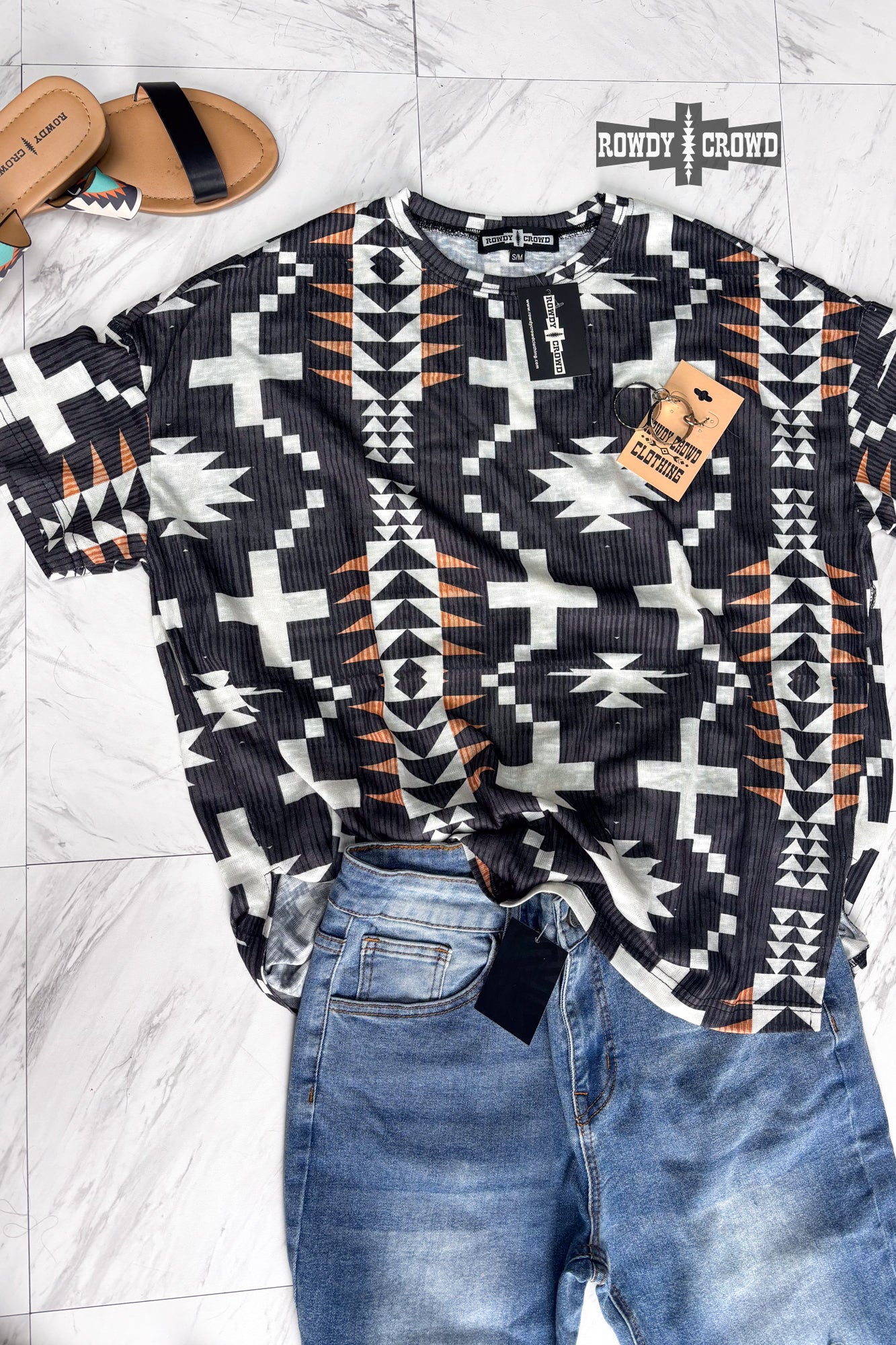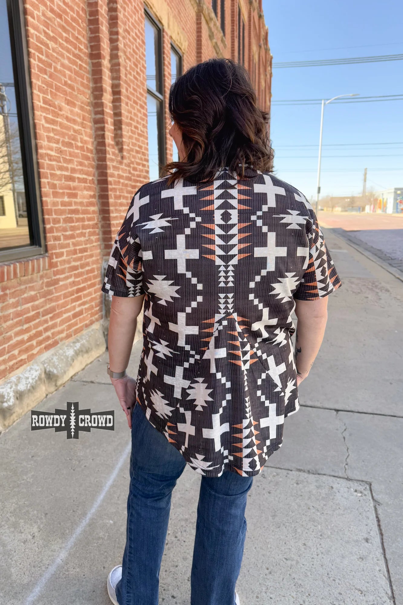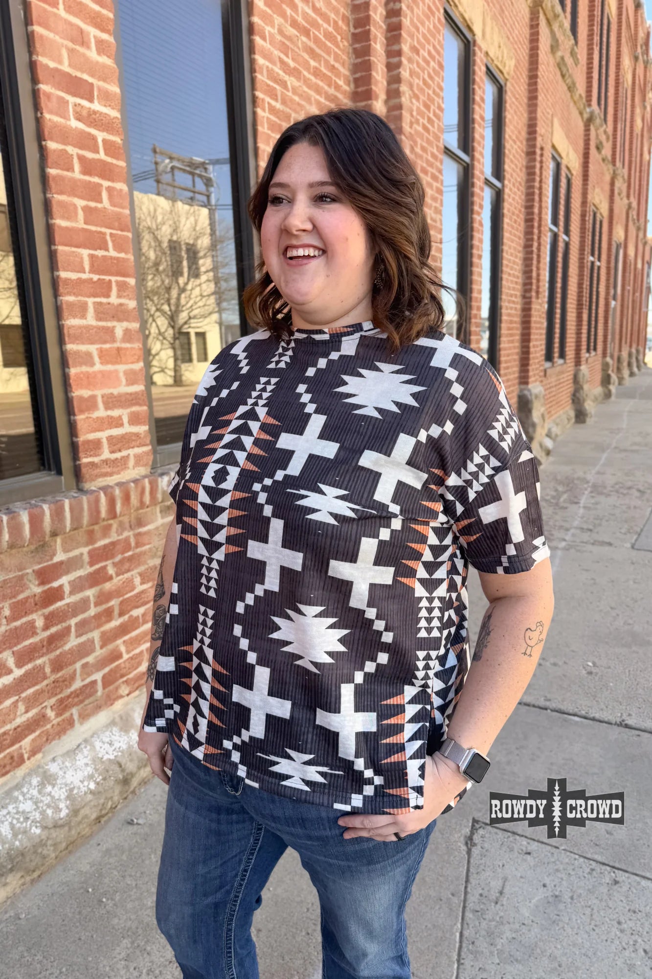 The Alamo Top features a striking black and white aztec print enhanced by orange accents. This shirt is oversized, lightweight, and slouchy making it a perfect summer addition to your wardrobe. Whether paired with jeans for a casual outing or layered over a sleek skirt for a night out, the Alamo Top is sure to turn heads and spark conversations.